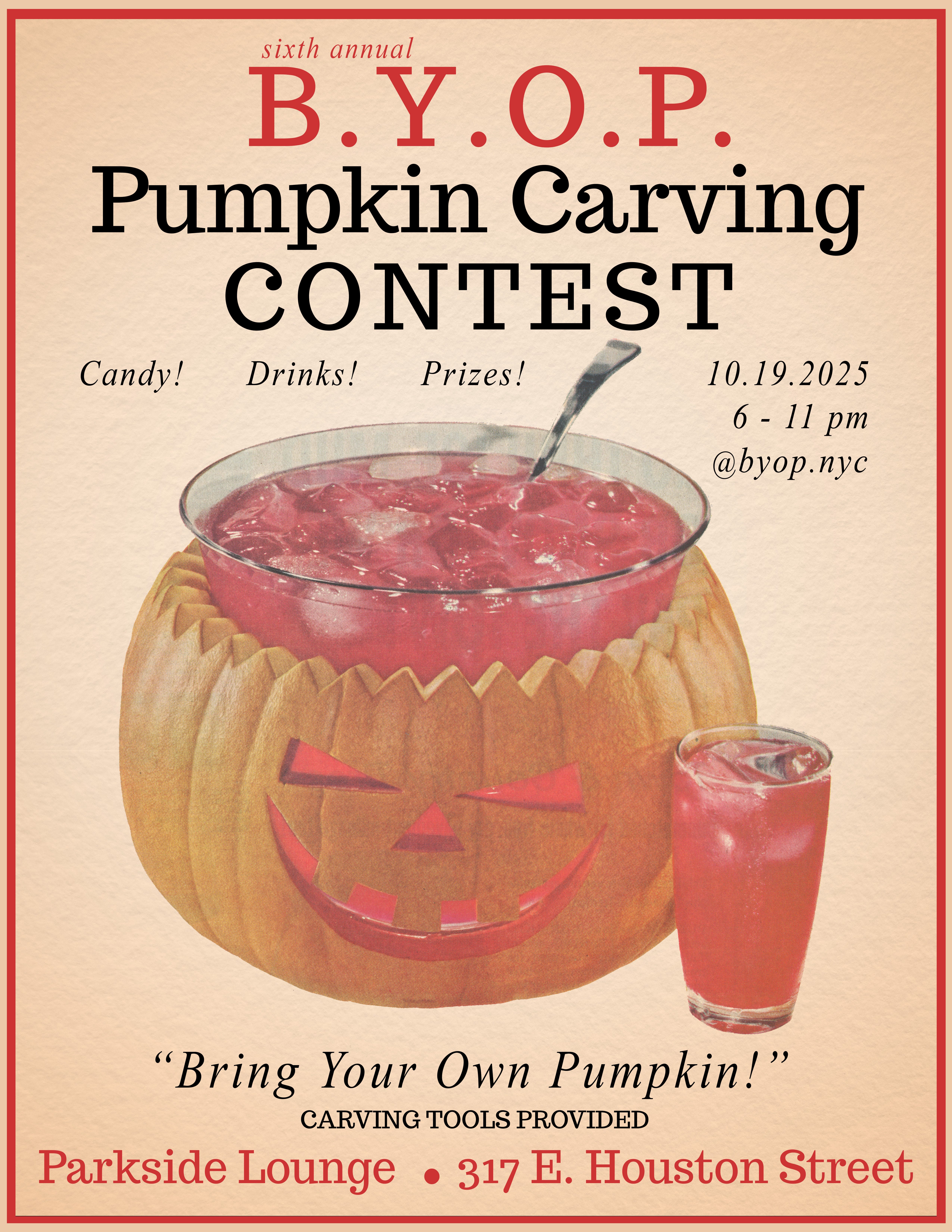 SM: B.Y.O.P. stands for Bring Your Own Pumpkin, it’s a carving contest I host every year— there’s trophies for three different categories: funniest, most creative, and best in show. I provide candles, carving tools, candy and party favors— all you have to do is bring a pumpkin!